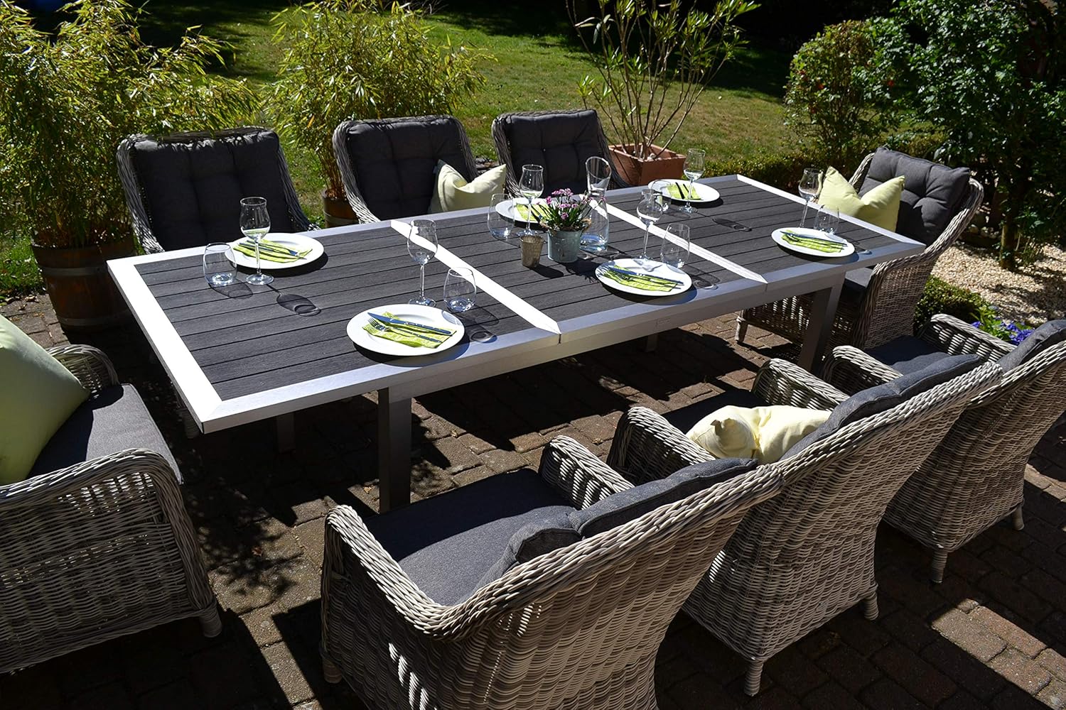 Terrasse Bomey Essgruppe Stockholm In Edelstahllook I 8 Teilige Garnitur I Rattan Sessel Set Bestehend Aus Acht Sesseln In Grau Und Polstern In Grau I Aufziehbarer Tisch Fur Garten Wintergarten Gartenmobel Zubehor Gartenmobel Sets