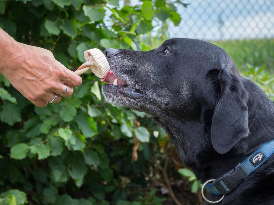 Als Grundzutat für das selbstgemachte Hunde-Eis kann eine Brühe laktosefreier Naturjoghurt Quark oder Hüttenkäse dienen. Die Zutaten einfach gut verrühren in die Förmchen füllen und wer mag einen Stiel aus Kauknochen oder Hundespagetthi. Fertig ist die perfekte Abkühlung im Sommer.